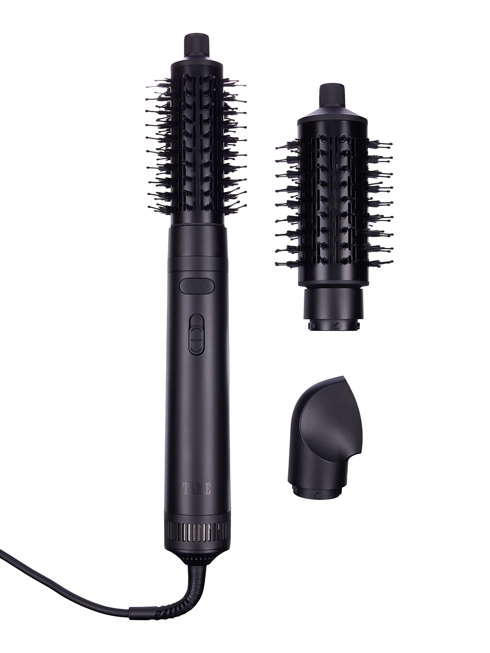 В комплекте 3 насадки: две щётки (маленькая и большая) и насадка-концентратор. Маленькая щетка удобна для прикорневой зоны и более точной работы, большая — для протяжки по длине и оформления формы. Концентратор поможет быстро просушить волосы перед основной укладкой.