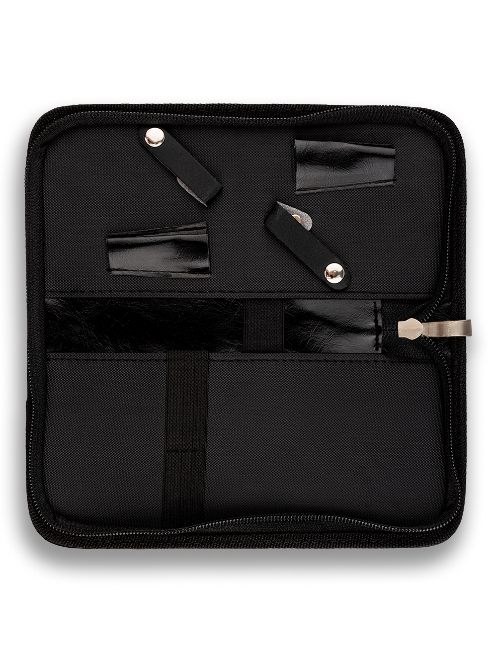Аксессуар выполнен из экокожи красного цвета. Внутри предусмотрено место для двух пар ножниц, а также отделения для расчесок различных размеров, - это обеспечит удобство и порядок. Молния надежно защищает содержимое, предотвращая случайное выпадение инструментов.